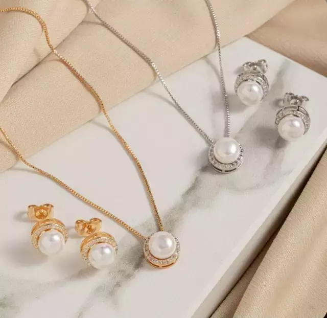 Os brincos são de pérolas cravejadas em zircônias e o colar segue o mesmo padrão de design.